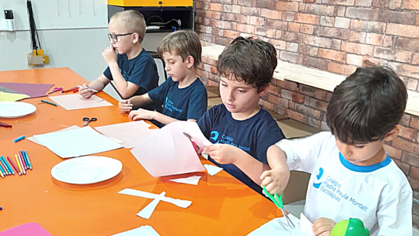 Uso de tesoura, cola líquida branca sem auxílio de pincel.